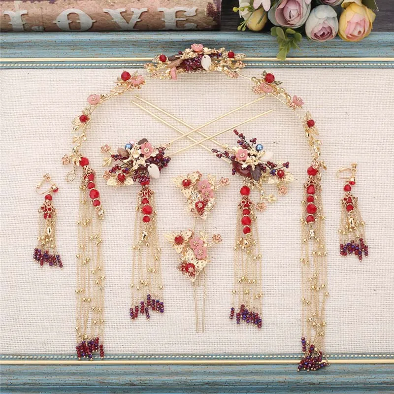Forseven Chinese Ancient Gold Color Phoenix Crown Hairpins Traditional Wedding Jewelry Set
