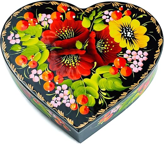 Petrykiv Ethnic Floral Style Heart Shaped Lacquered Wooden Jewelry Ukrainian Jewelry Box