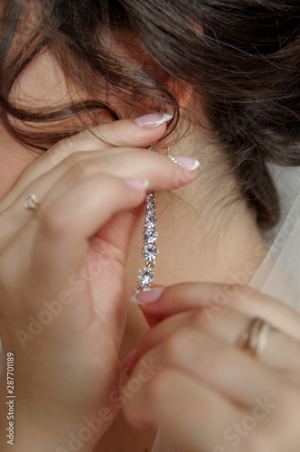 Wedding Day Wedding Earrings On A Female Hand She Takes The Wedding Day Wedding Jewelry For Bride